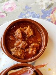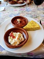 When you make your reservation, you must choose whether you prefer to eat on your own or book the option that includes a tapas menu, consisting of a small casserole of asadillo manchego with ventresca (tuna belly), the house Russian salad, a skewer of potato omelette, scrambled eggs with ham, a small casserole of Carcamusas and a drink (water, glass of wine, beer or soft drink). If you prefer, you can change the drink for another tapa or a dessert.