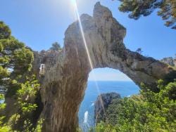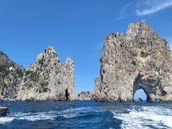 When we get to the island, we'll stay on board the boat and cruise around Capri, seeing all the natural wonders it has to offer, including the White Grotto and the Green Grotto. You'll be able to see the Natural Arch from the Palaeolithic period and admire the modern structure of Villa Malaparte, located on the cliff top. Must-sees also include the Faraglioni, a famous rock formation, and the Punta Carena lighthouse.